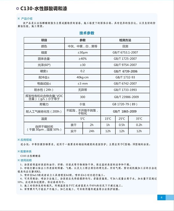 簡介—— 該產(chǎn)品是以水性醇酸樹脂為主要成膜物質(zhì)的面漆,施工粘度下的固體分高,具有優(yōu)異的性價(jià)比,以及良好的防腐蝕性能,施工簡便。