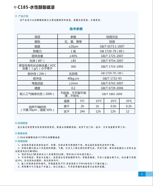 簡(jiǎn)介—— 該產(chǎn)品是以水性醇酸樹脂為主要成膜物質(zhì)的面漆,漆膜光澤度高,豐滿度好。