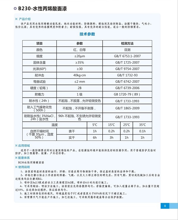 簡(jiǎn)介—— 該產(chǎn)品采用水性丙烯酸功能乳液、納米功能材料、防銹顏料、緩蝕劑及助劑制備。涂膜干燥快、氣味小、性價(jià)比高;具有良好的漆膜硬度