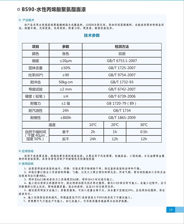 簡介—— 該產(chǎn)品采用水性脂肪族聚氨酯樹脂為成膜基料,以HDI為固化劑,添加環(huán)保型顏填料、功能助劑等材料制備而成。漆膜鄧滿,光澤度高