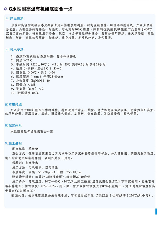 簡介—— 水性耐高溫有機(jī)硅面漆成分由專用水性有機(jī)硅樹脂、耐高溫顏填料、特種添加劑組成,產(chǎn)品為單組分包裝。具有優(yōu)異的耐熱性、耐溫變,