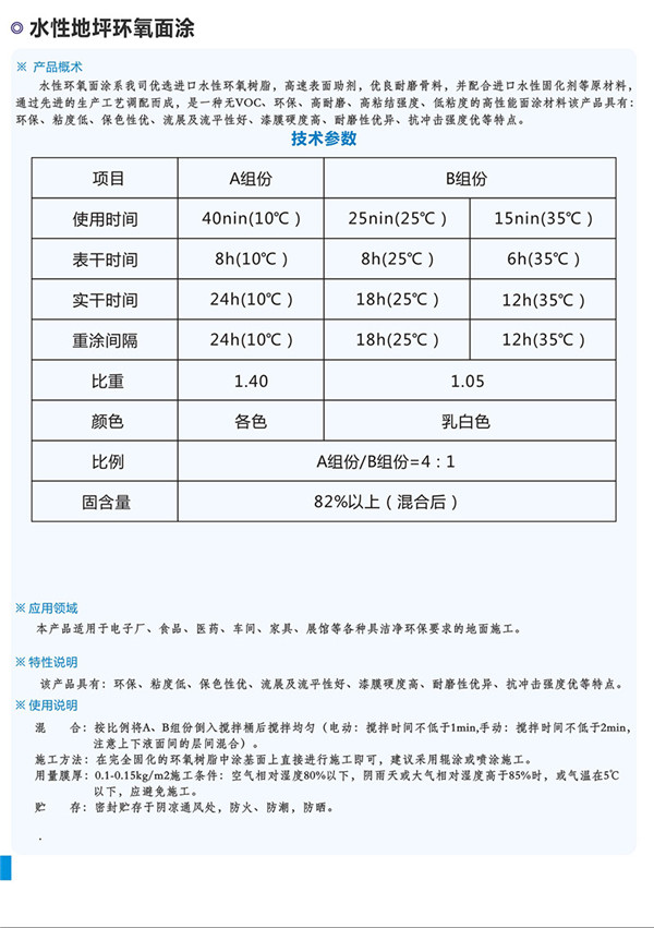 簡介—— 水性環(huán)氧面涂系我司優(yōu)選進(jìn)口水性環(huán)氧樹脂,高速表面助劑,優(yōu)良耐磨骨料,并配合進(jìn)口水性固化劑等原材料,通過先進(jìn)的生產(chǎn)工藝調(diào)配