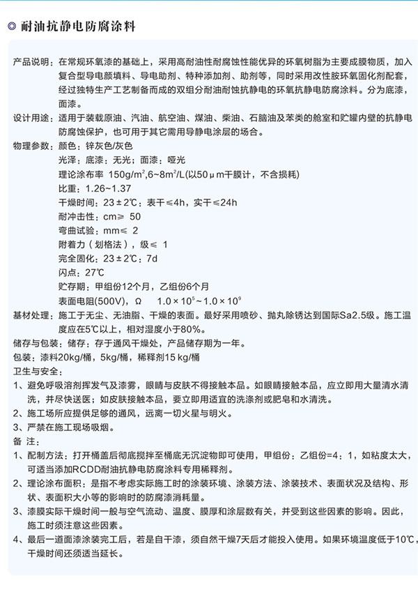 簡介—— 產(chǎn)品說明:在常規(guī)環(huán)氧漆的基礎(chǔ)上,采用高耐油性耐腐蝕性能優(yōu)異的環(huán)氧樹脂為主要成膜物質(zhì),加入復(fù)合型導(dǎo)電顏填料、導(dǎo)電助劑、特種