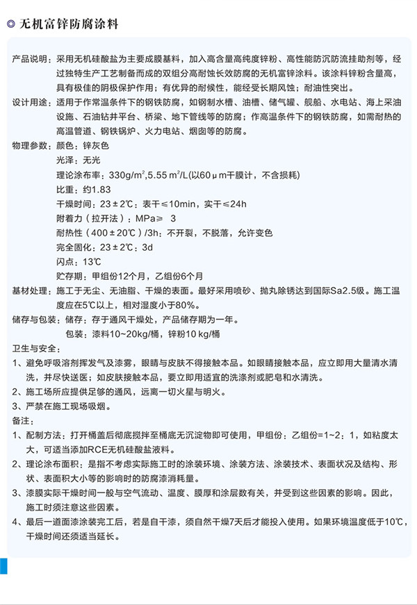 簡(jiǎn)介—— 產(chǎn)品說(shuō)明:采用無(wú)機(jī)硅酸鹽為主要成膜基料,加入高含量高純度鋅粉、高性能防沉防流掛助劑等,經(jīng)過(guò)獨(dú)特生產(chǎn)工藝制備而成的雙組分高