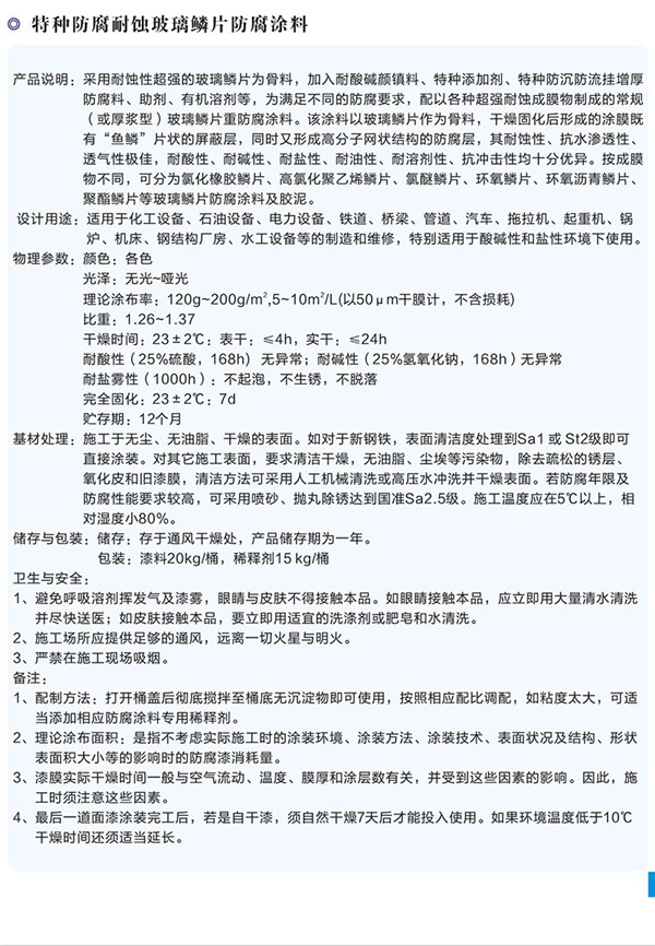 簡介—— 產品說明:采用耐蝕性強的玻璃鱗片為骨料,加入耐酸堿顏鎮(zhèn)料、特種添加劑、特種防沉防流掛增厚防腐料、助劑、有機溶劑等,為滿足