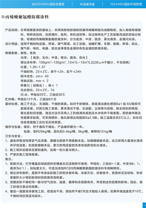 簡介—— 產(chǎn)品說明:在常規(guī)聚氨漆的基礎(chǔ)上,采用高耐蝕耐候的經(jīng)基丙烯酸樹脂為成膜物質(zhì),加入耐候顏料、特種添加劑、填料,助劑,有機(jī)溶劑
